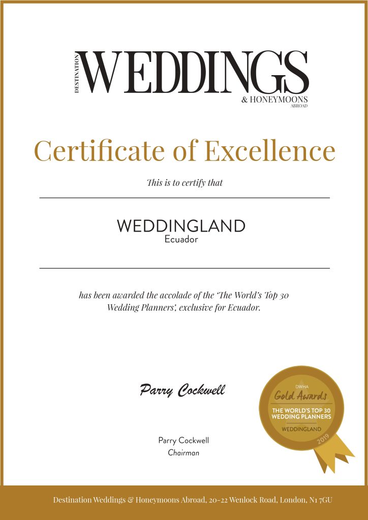 Weddingland Ecuador has been awarded a Certificate of Excellence by Destination Weddings & Honeymoons Abroad, placing it among The World’s Top 30 Wedding Planners. This prestigious international recognition highlights exceptional creativity, refined service, and expertise in destination wedding planning.