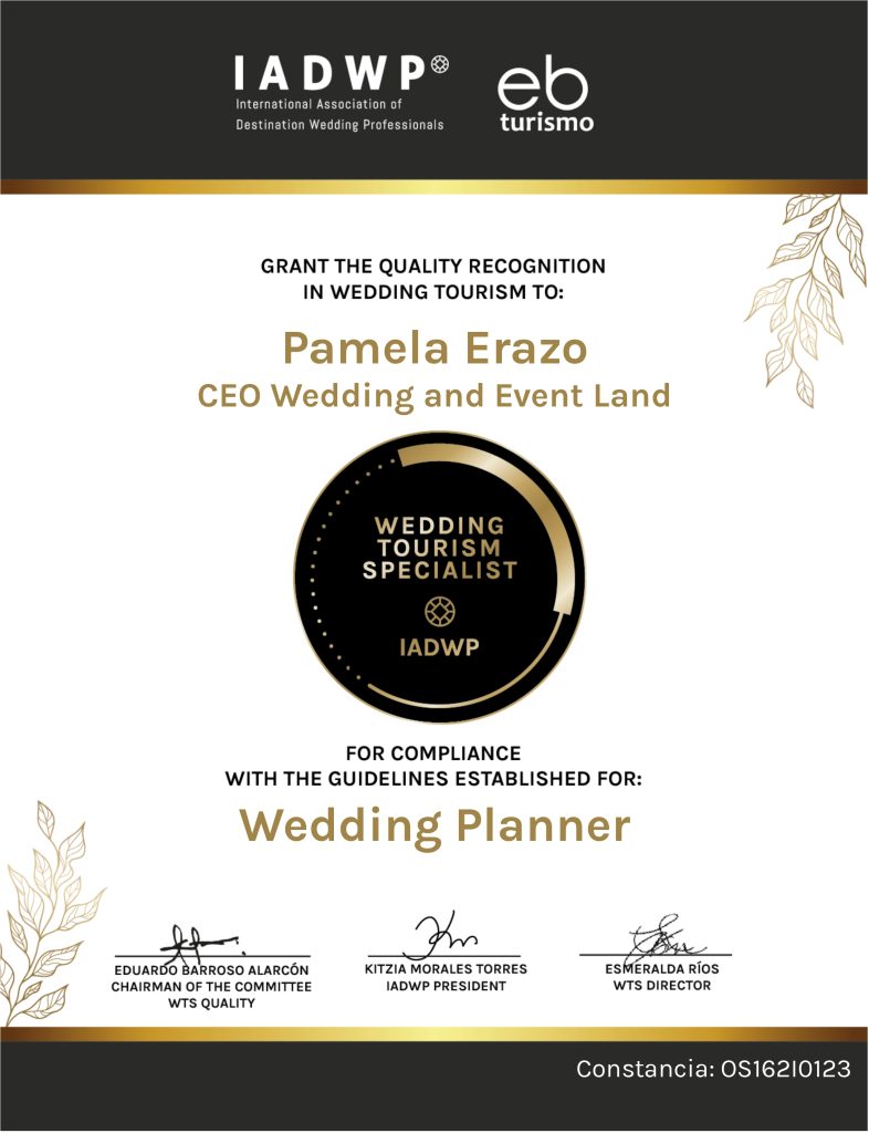 As a recognized Pamela Erazo wedding planner, her participation in this international awards ceremony in Colombia reinforces her growing presence across Latin America. This achievement positions her as a trusted professional known for delivering exceptional experiences, creativity, and quality within the global destination wedding industry.
